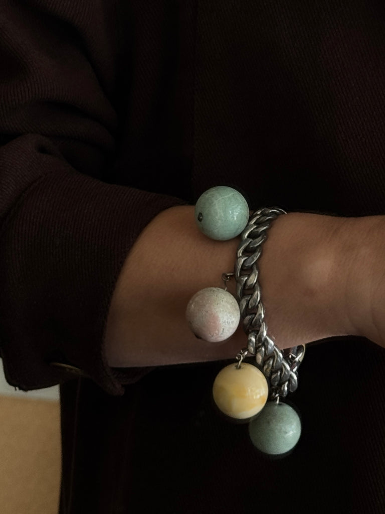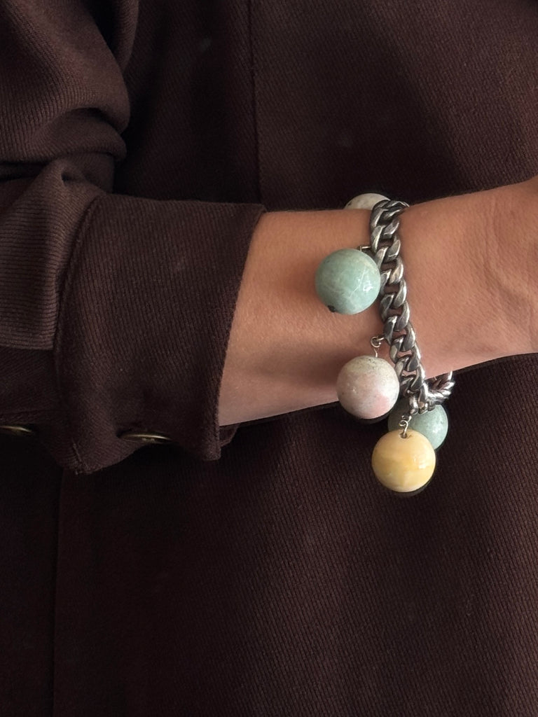 Carpenter.StudioThick sterling silver curb chain bracelet featuring 6 marble beads in teal (2) , pale yellow (2), white (1), and pink. (1)