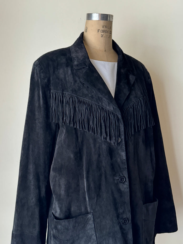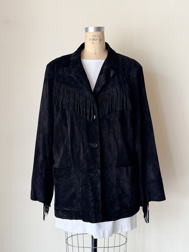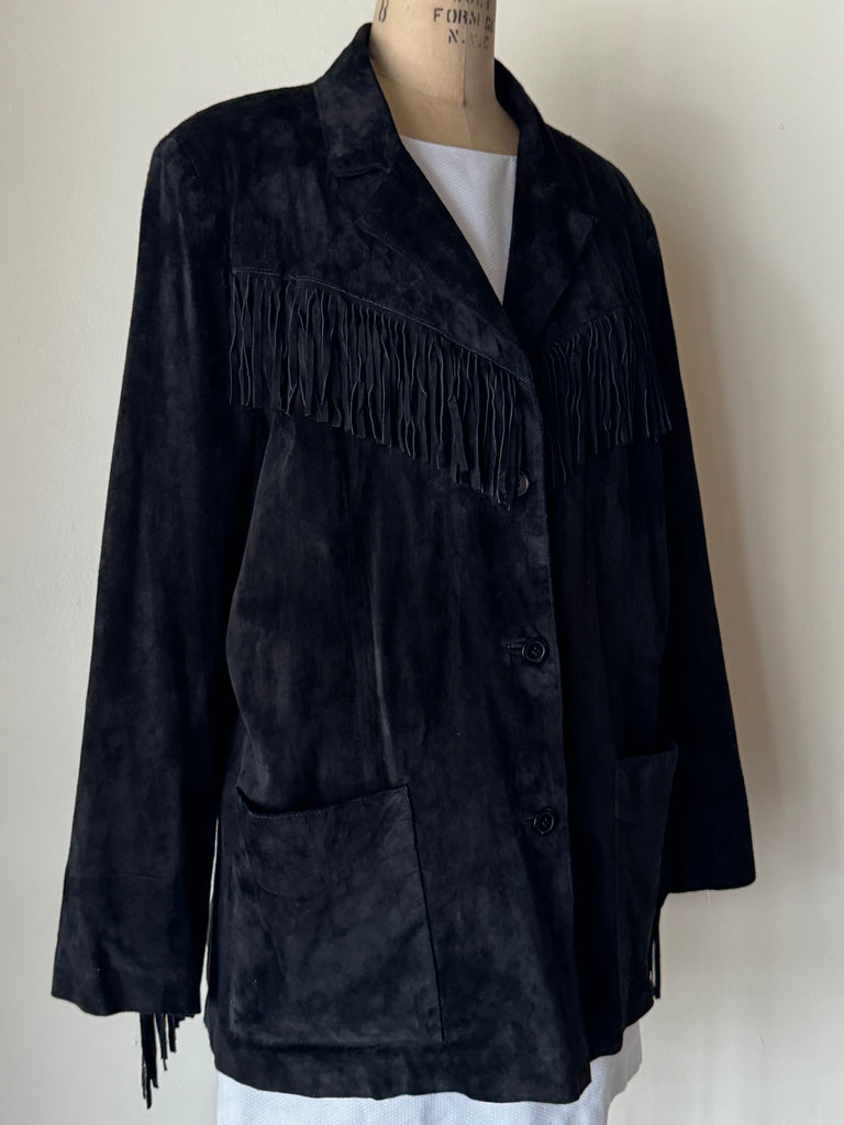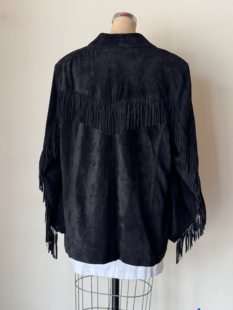 features two front pockets and fringe at the chest, arms and back shoulders.