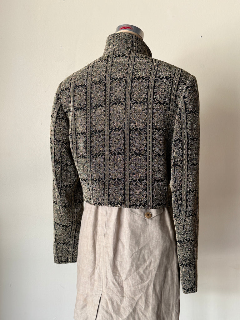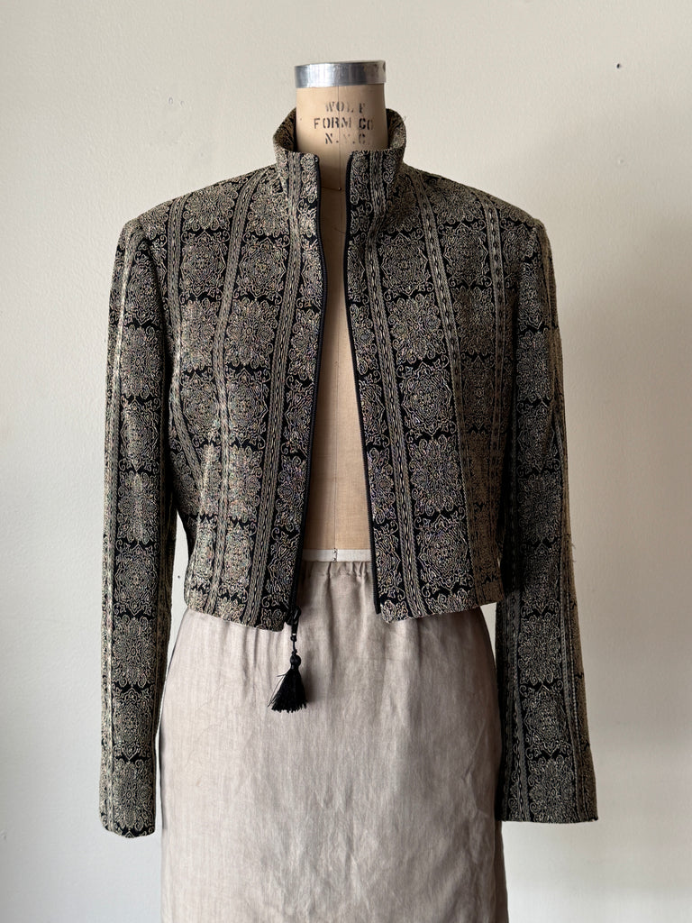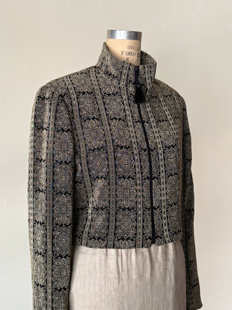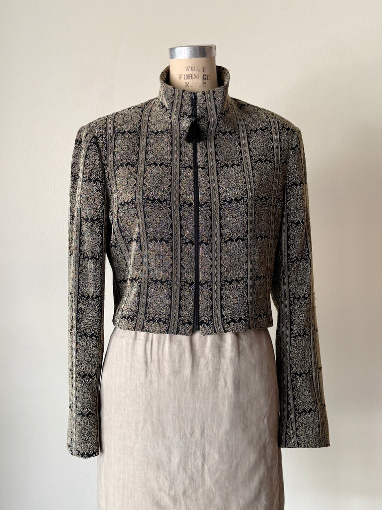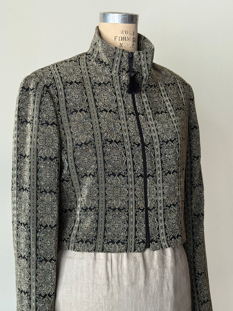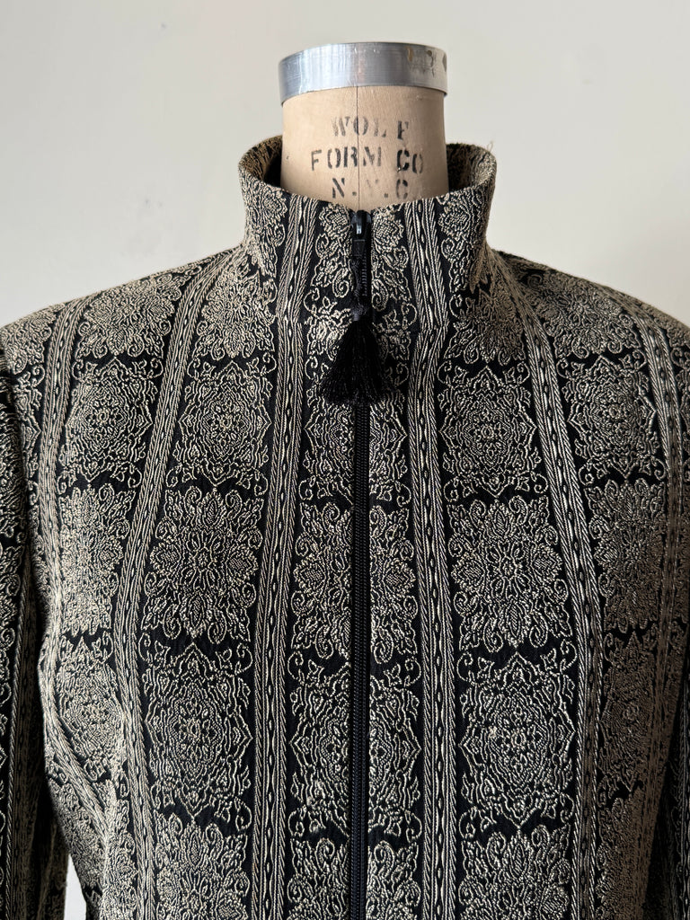 Carpenter.StudioLoveliest black and beige embroidered jacket with fringe zip and a mock neck.