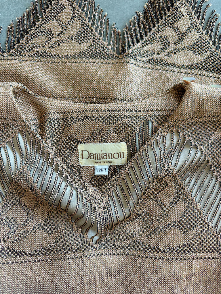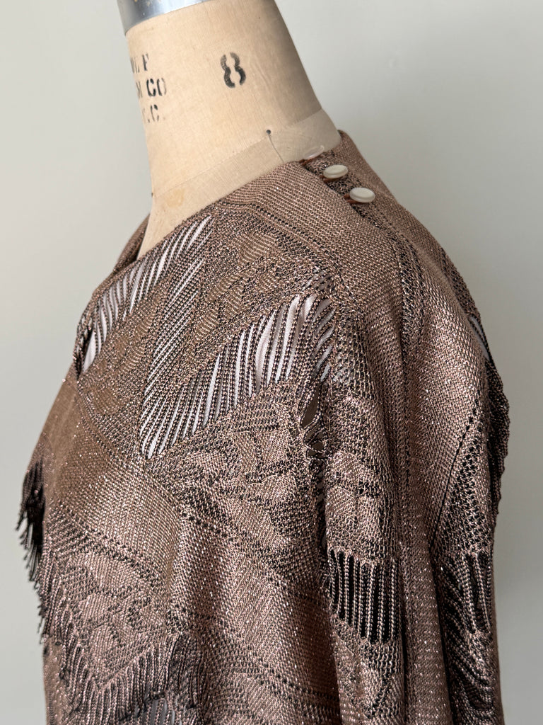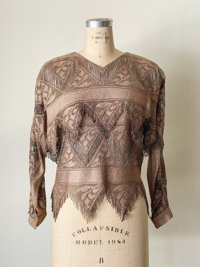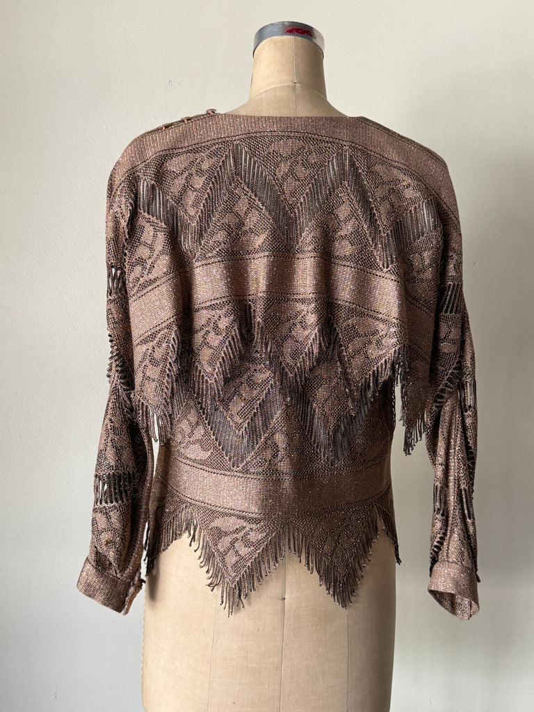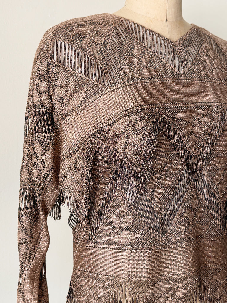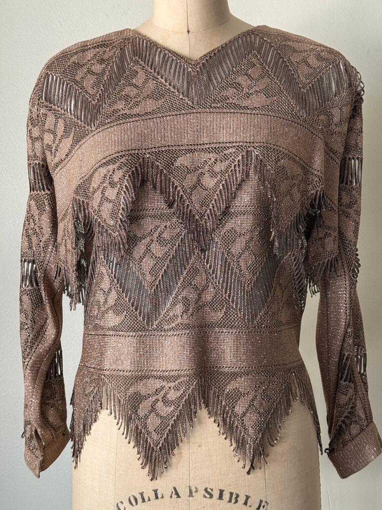 Carpenter.StudioStunning pinky metallic crochet blouse with layered fringe and dolman sleeves. Has a matching skirt available and sold separately.