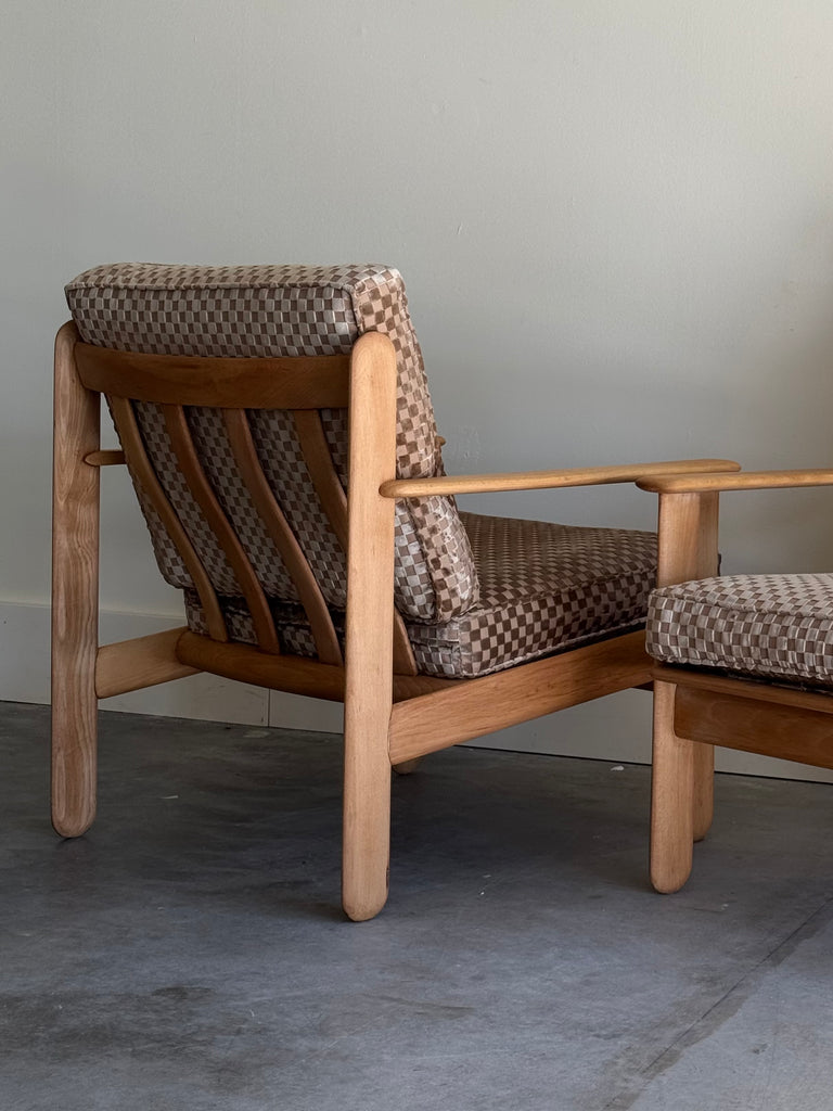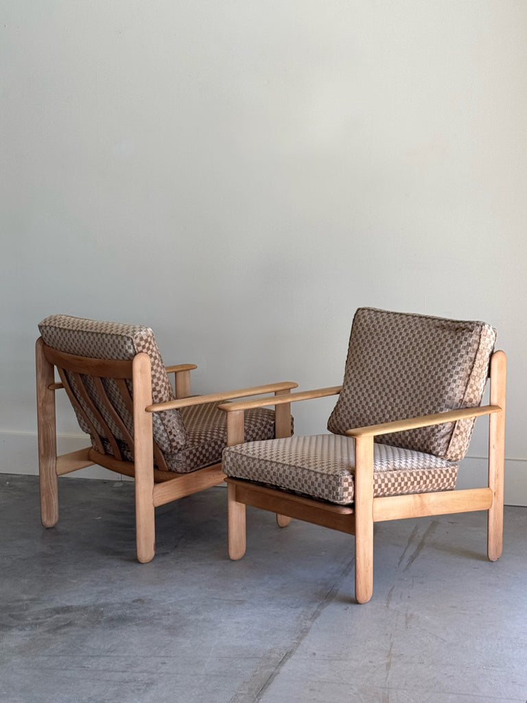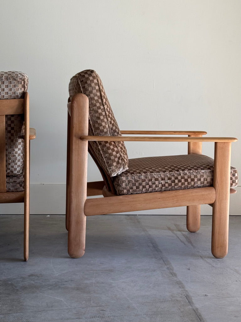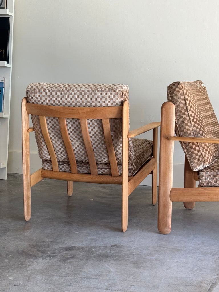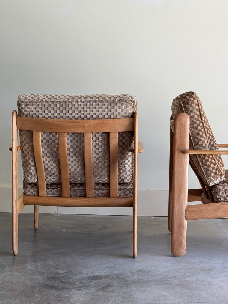 MID CENTURY OAK + CHECKERED VELVET CHAIRS