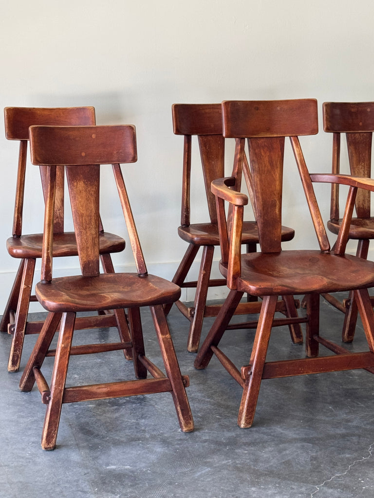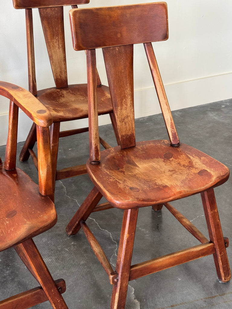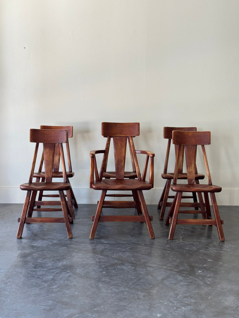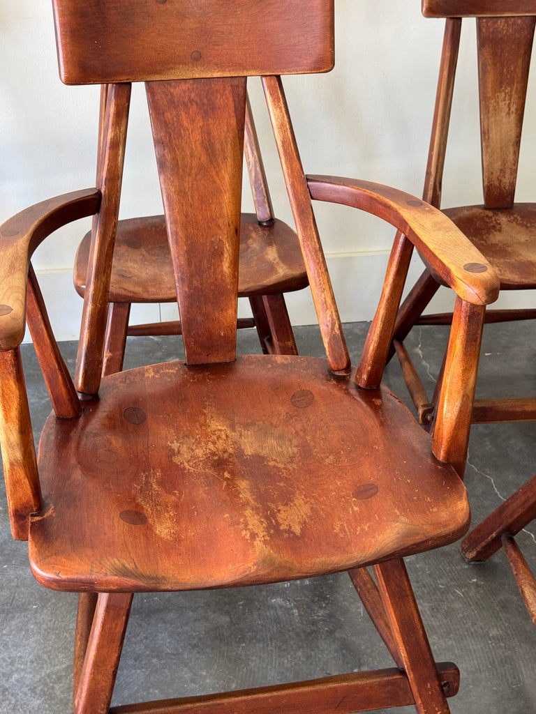 Carpenter.StudioDesigned by Herman Devries for Cushman Colonial Creations, produced only in 1936-37. Made of heavy rock maple. Vintage wear consistent with age. We have kept its original patina from age but have sanded and polished them smooth. 1 captains chair and 5 side chairs.