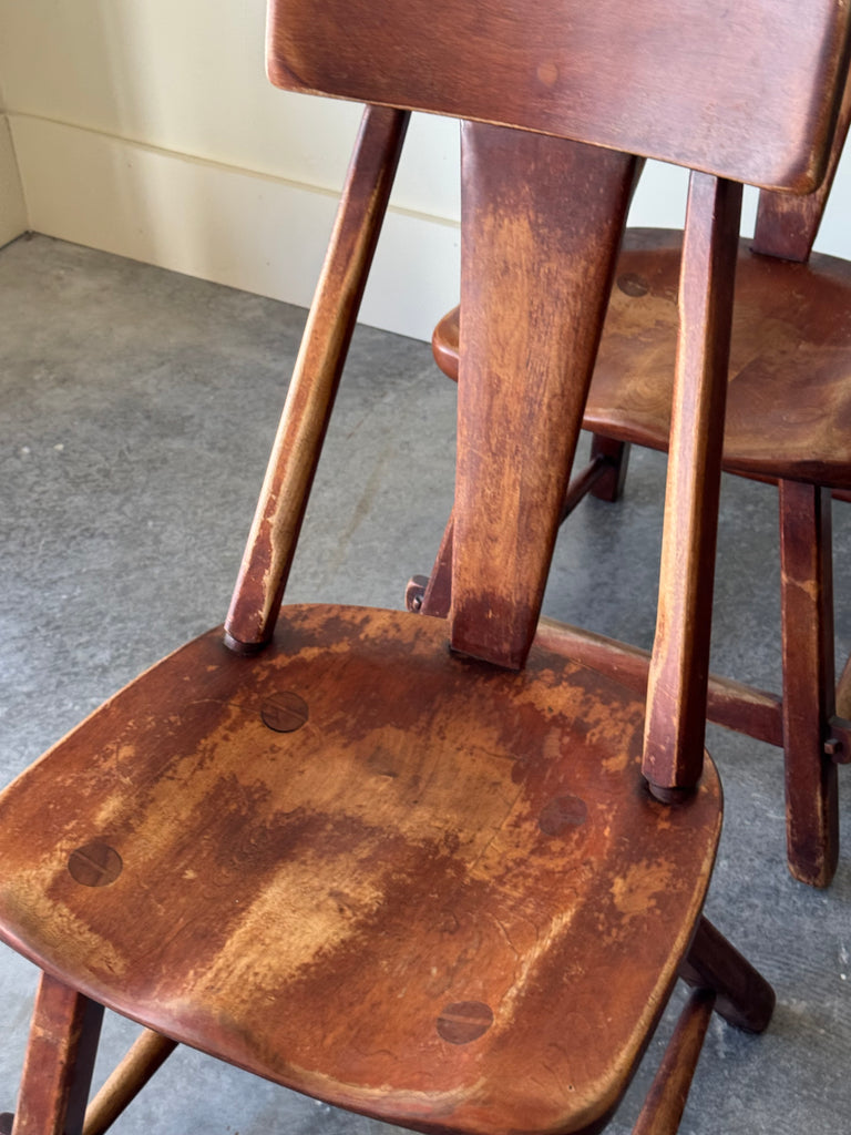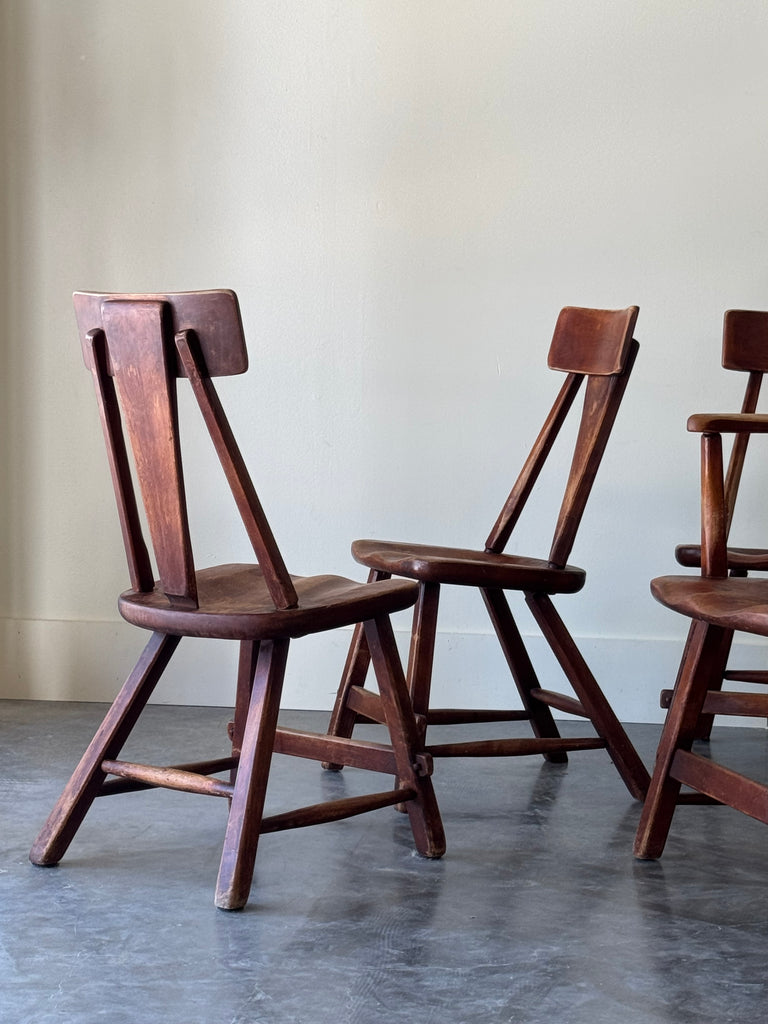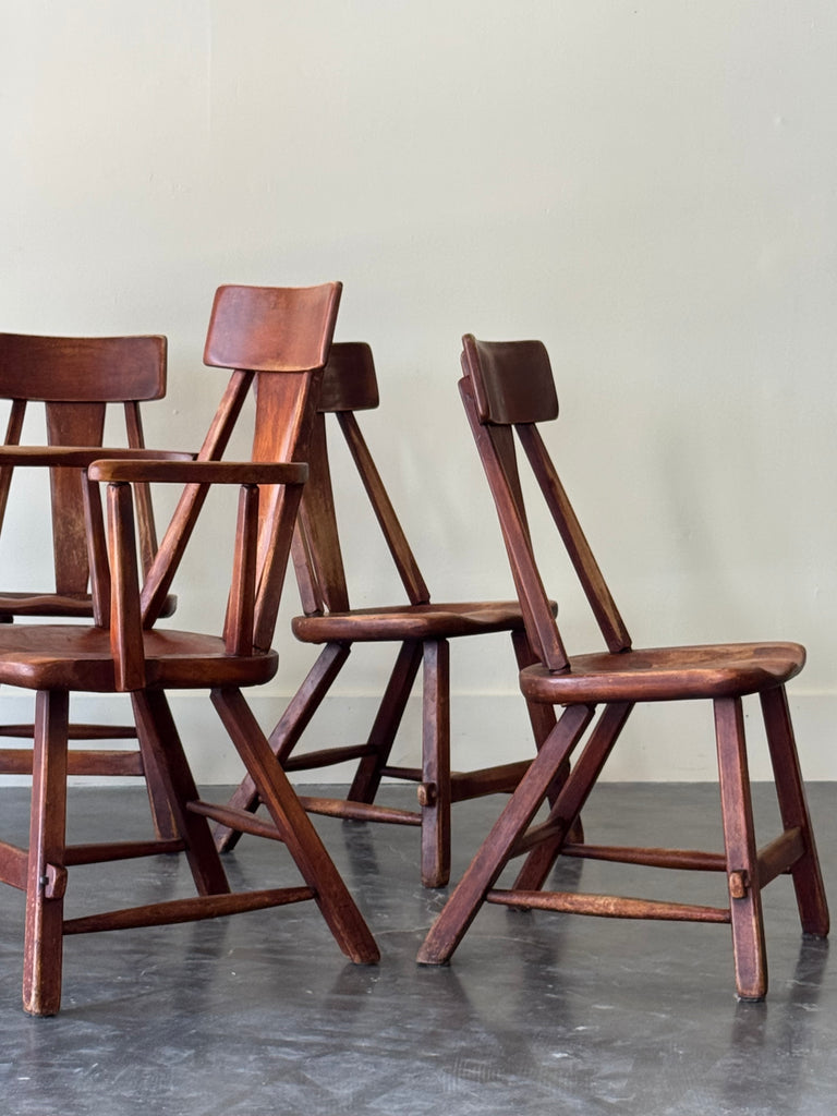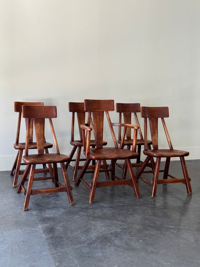 Carpenter.StudioDesigned by Herman Devries for Cushman Colonial Creations, produced only in 1936-37. Made of heavy rock maple. Vintage wear consistent with age. We have kept its original patina from age but have sanded and polished them smooth. 1 captains chair and 5 side chairs.