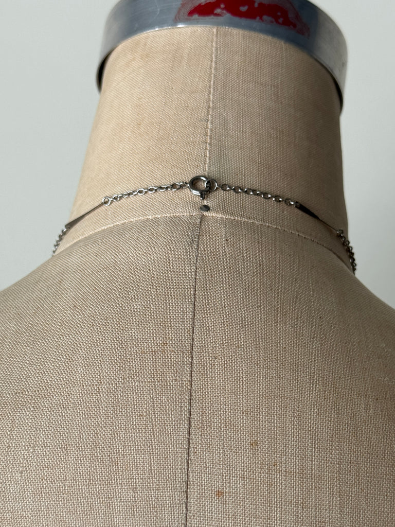 carved horn fish with coral and turquoise plastic bead on silver chain.