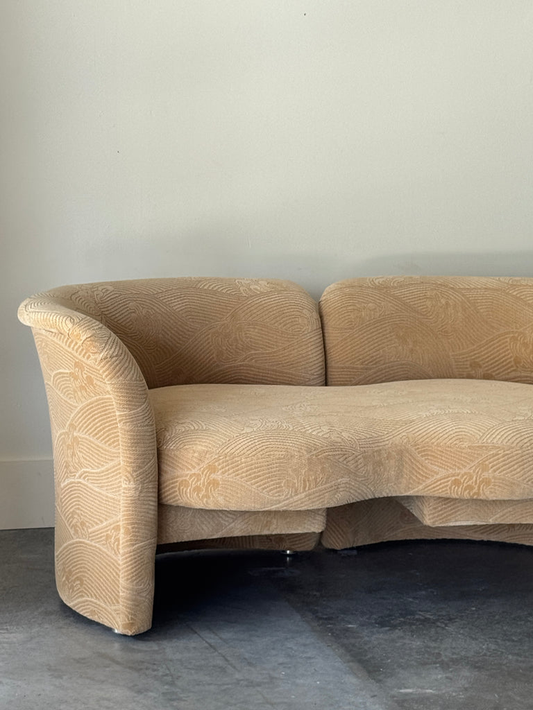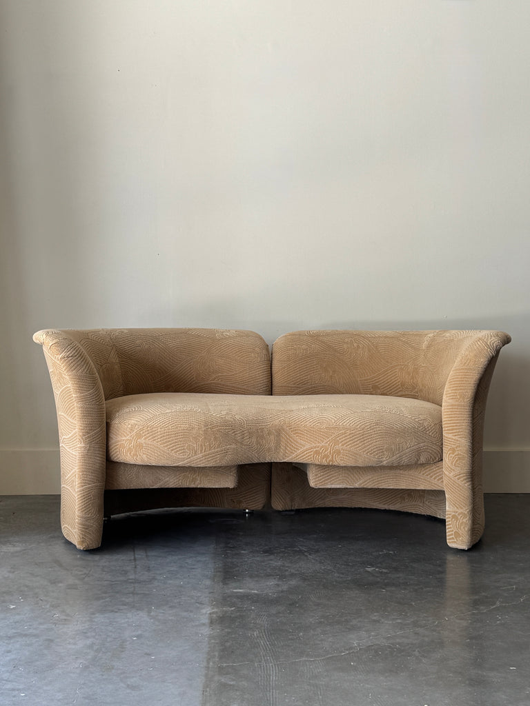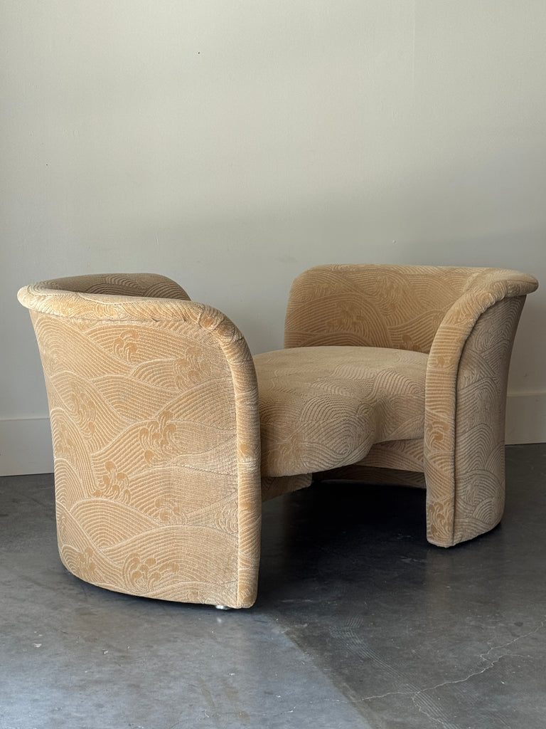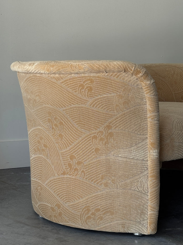Carpenter.StudioNewly reupholstered in designer cut velvet in topaz beige “Vervain Stonewaves” has a very are art deco feel. Shows as a warm yellow beige.