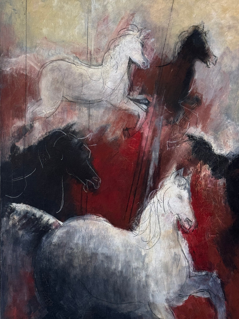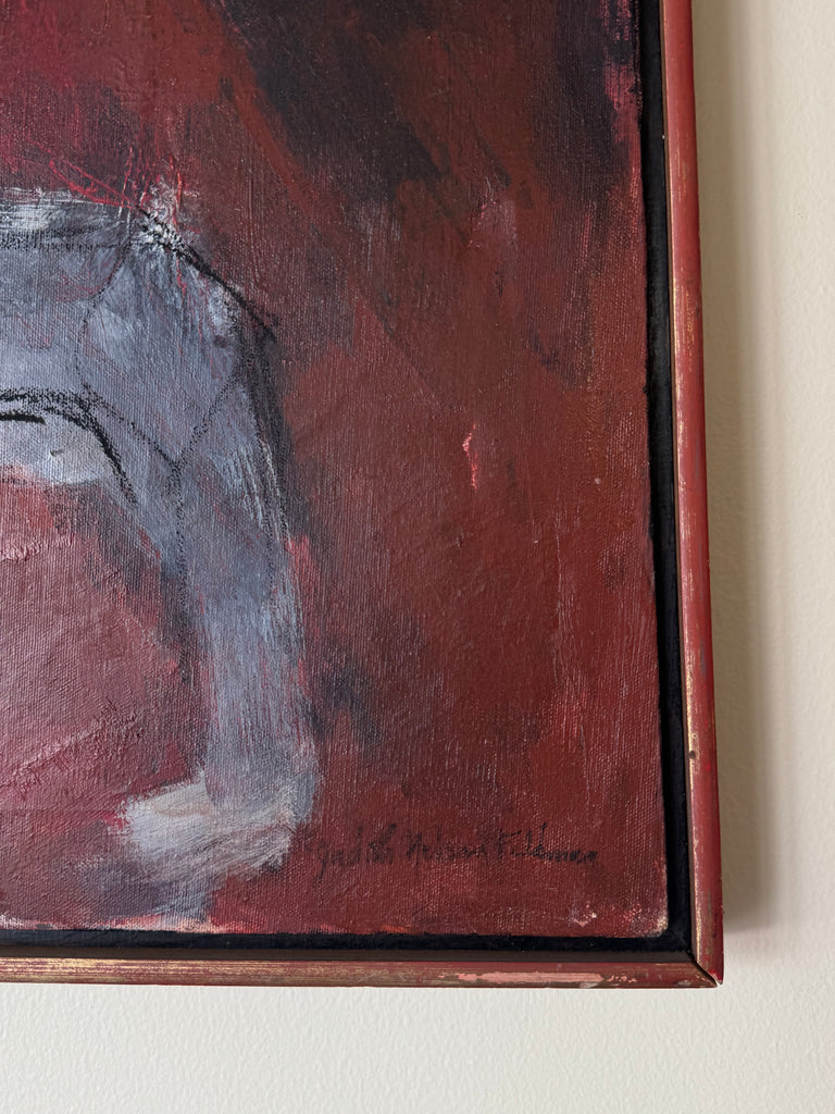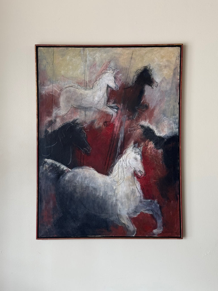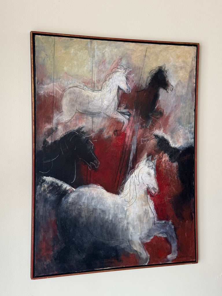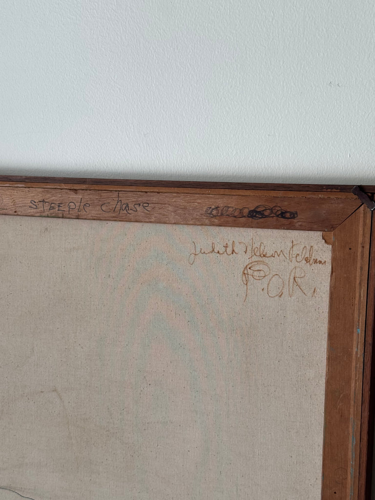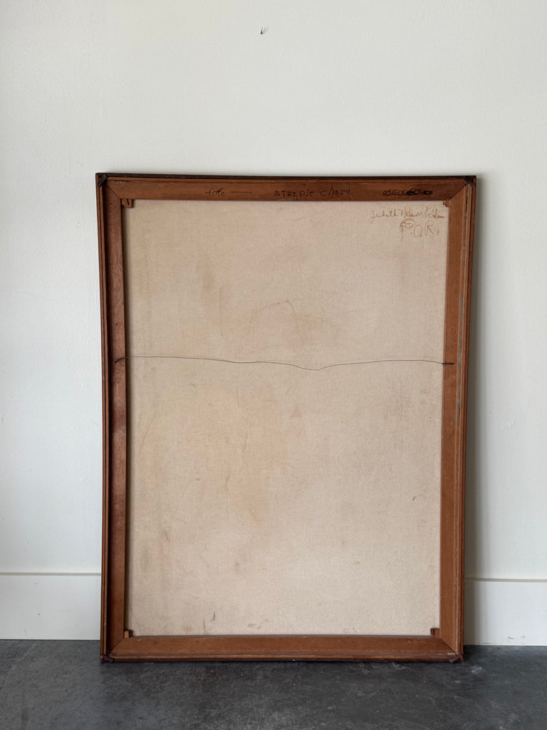MID CENTURY ORIGINAL “STEEPLE CHASE” PAINTING IN WOOD FRAME ARTIST SIGNED
