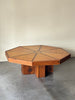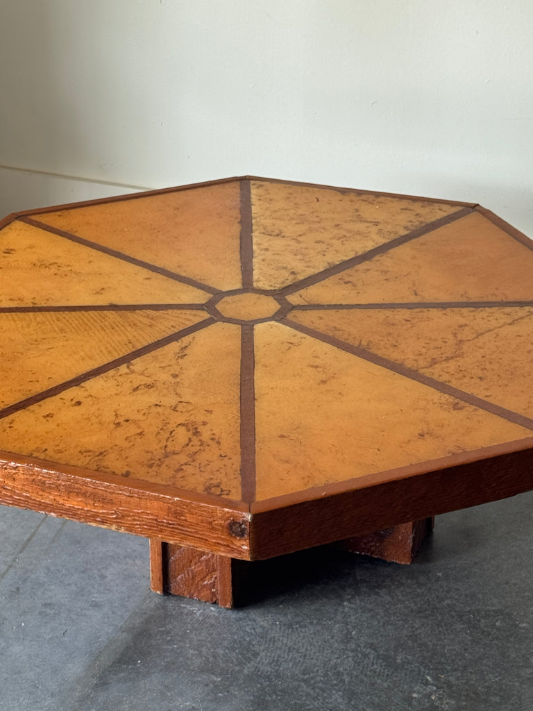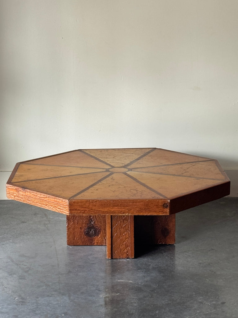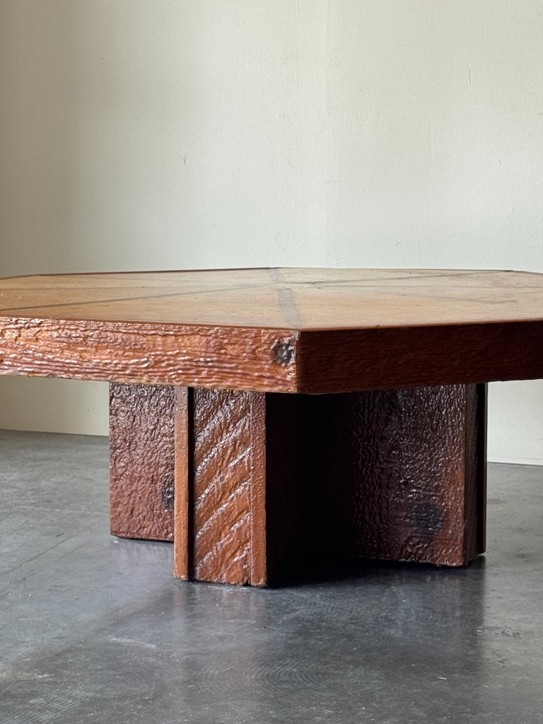 Carpenter.StudioHobbyist made table, coral stone top with cypress wood base. Stone top has been seal with resin so it is smooth to the touch.