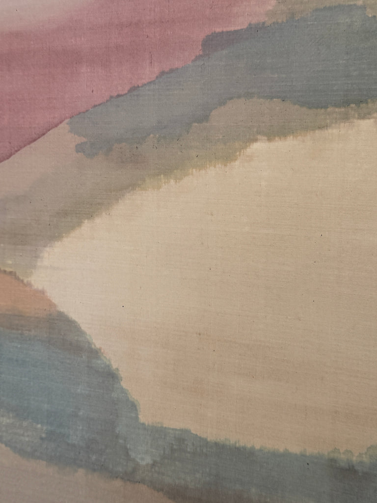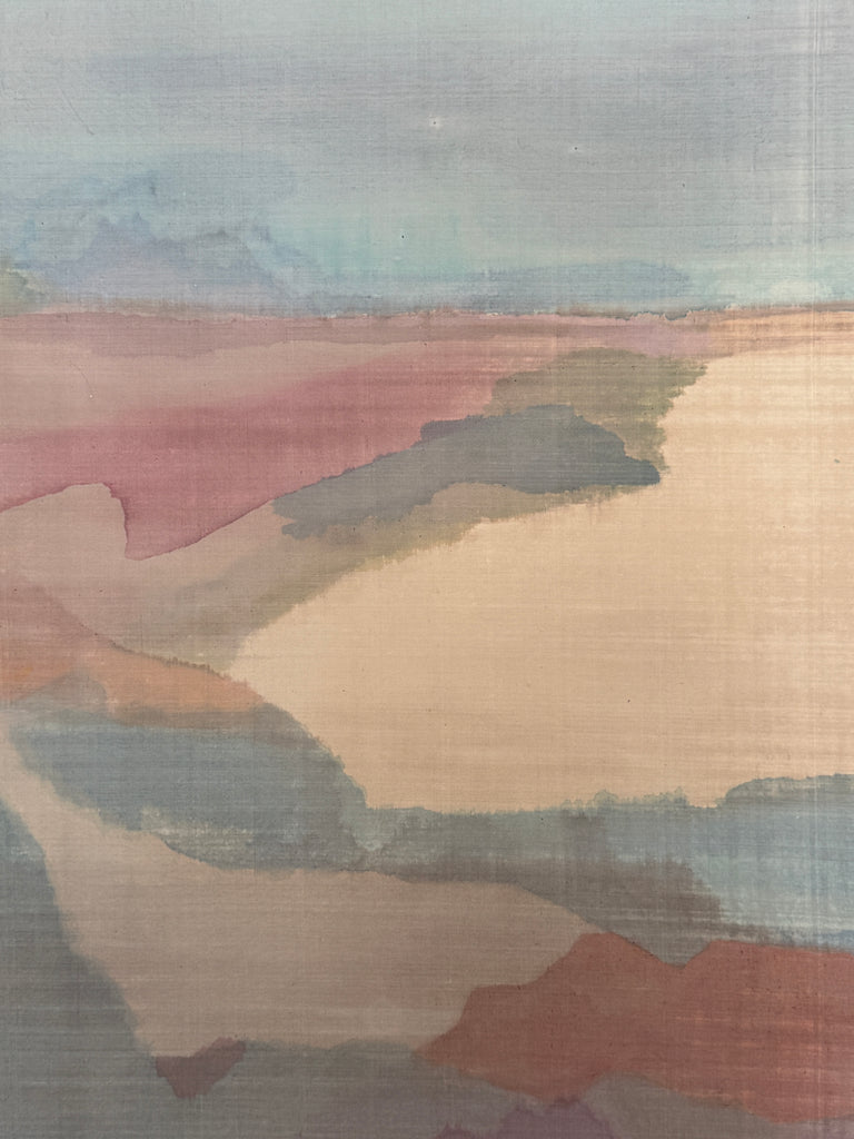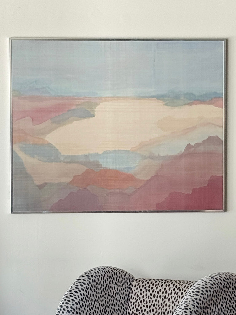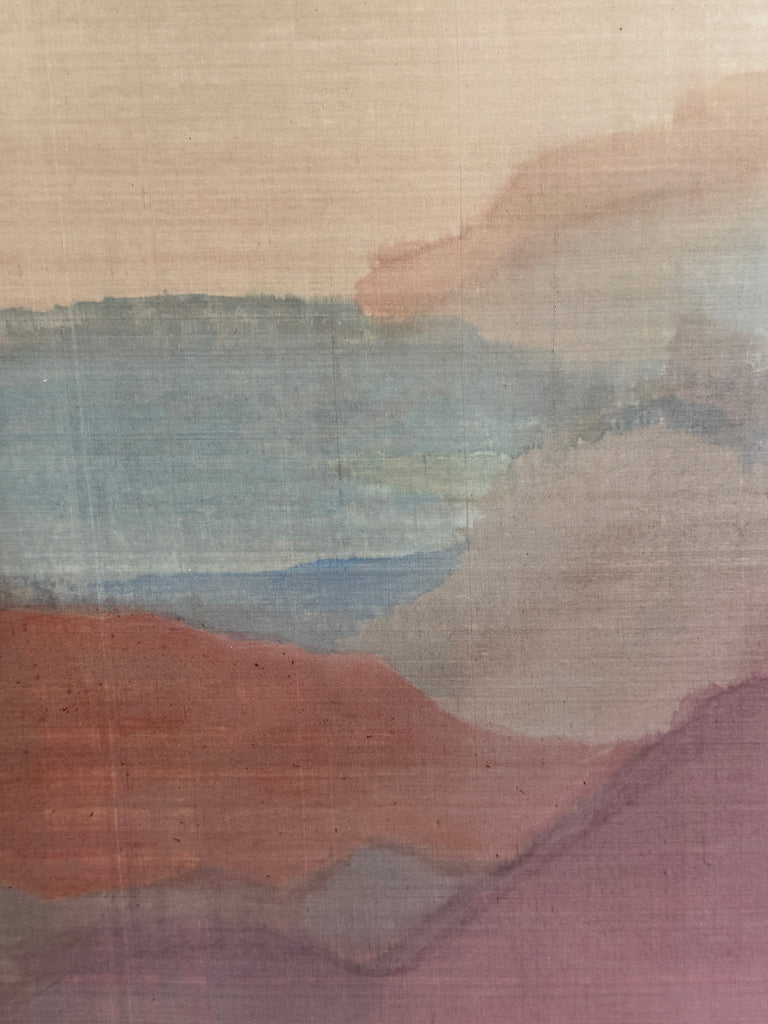 Gouache painting on silk by artist Constance Q. Heller. 36”w x 30”H in original chrome frame.