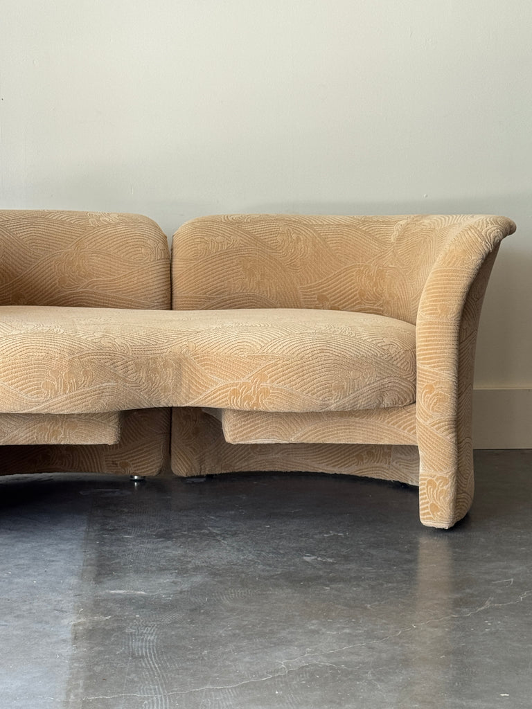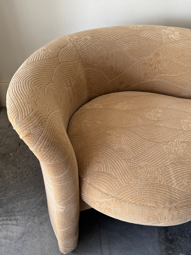 Carpenter.StudioNewly reupholstered in designer cut velvet in topaz beige “Vervain Stonewaves” has a very are art deco feel. Shows as a warm yellow beige.